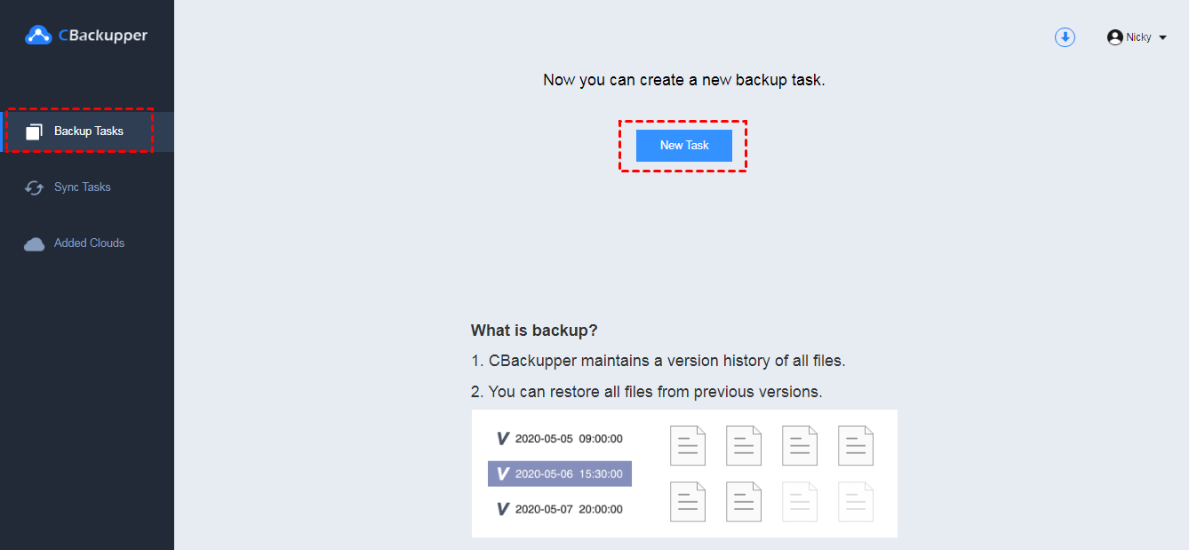 Step 3. Next, click the Backup Tasks tab on the left side of the page. And then, click the + button and click the New Task button.