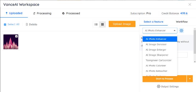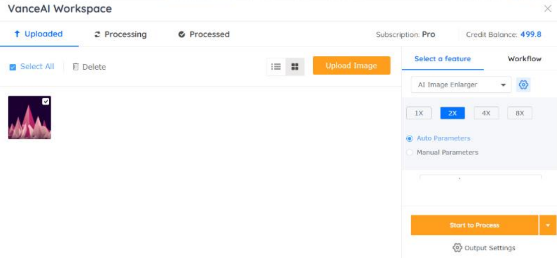 2. The VanceAI Enhancer Workspace works the same as any other VanceAI tool. Therefore, upload an image, manage settings if needed, and go over to Start to Process to start processing the image.