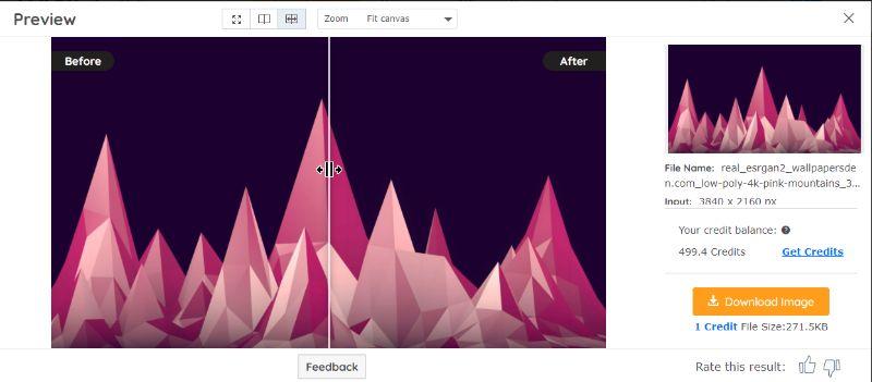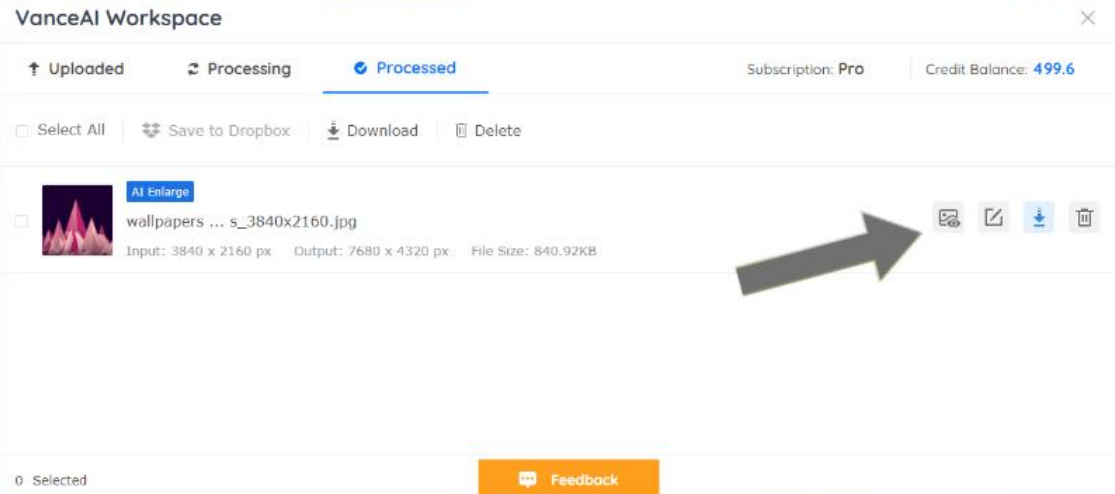3. The app will enlarge the image in a few seconds and show you a notification on the Processed tab. Go there and use the Preview icon on the right. Next, use the Download Image button to save the image.