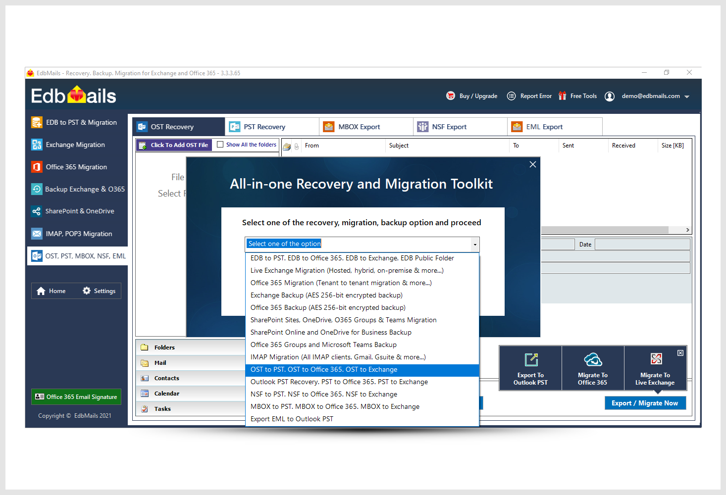 In the next screen, you have multiple recovery and migration operations. Of course, using the free trial version, you can test out all these features for free. The licensed version allows for a full-fledged use of the tool. Since we are dealing with OST to PST conversion, select the corresponding option.