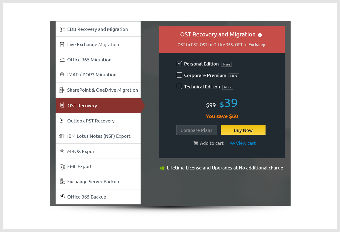 There are three license editions available which are Personal, Corporate Premium, and Technical licenses. The Personal edition is a basic license that permits OST to PST conversion on a restricted number of computer installations and is suitable for small users. With a Corporate Premium Edition, the software can be used on several computers for corporate requirements making it perfect for small, medium businesses, government agencies, and educational institutions. The software’s Technical license allows for an unlimited number of installations and user locations ideally suited for Data Recovery, Computer Repair, and Maintenance companies. Unlike other products that only offer a single license plan, we can highlight that EdbMails’s pricing plans are tailored to different users and requirements.