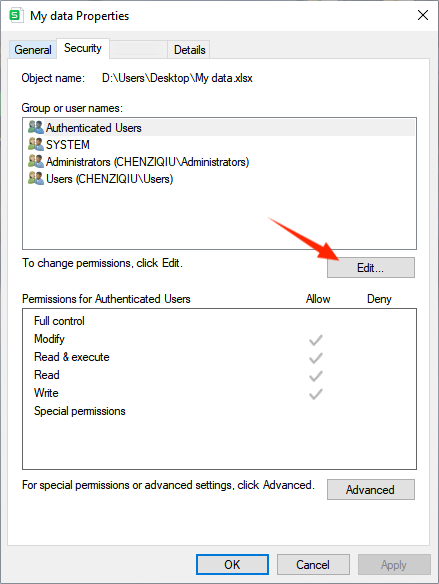 If you get the “Excel file format or file extension is not valid” error due to insufficient permissions, you can try editing the file permissions using the following steps: