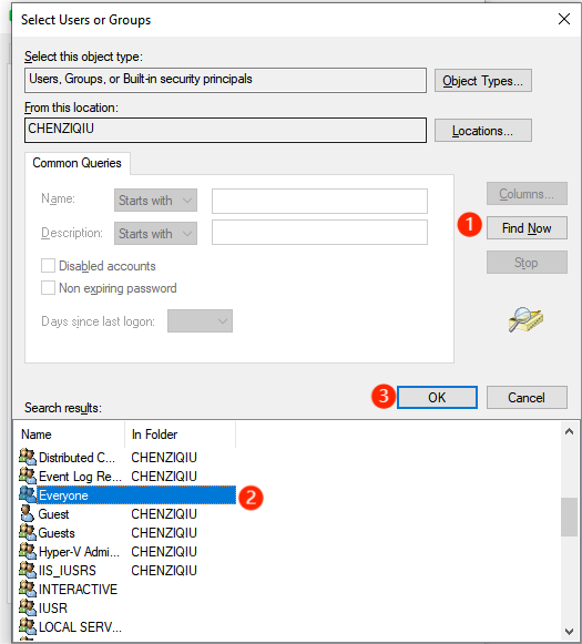 Step 5:Click on “Find Now” to display a list of all users and groups. Then, Select the “Everyone” group from the list and choose “OK.”