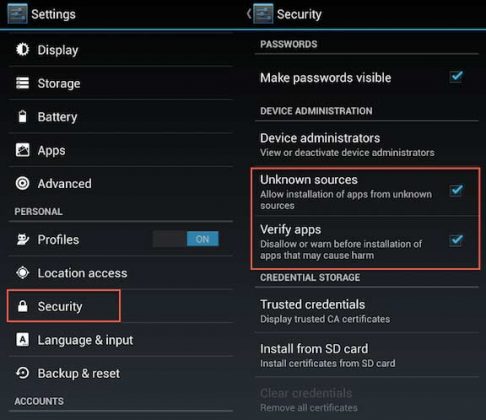 4. Go to Settings → Security and allow installation of apps from sources other than the Play Store.