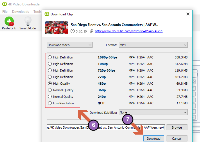 7. Choose a resolution and quality of video(s) and click the “Download Selected Videos” button