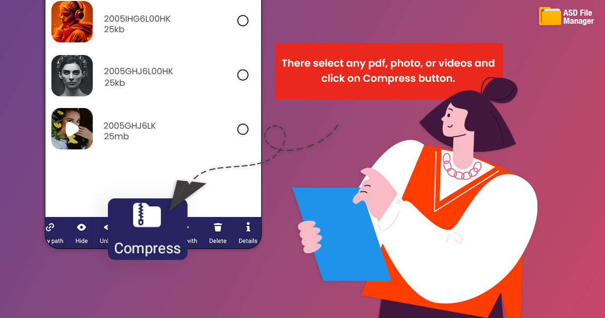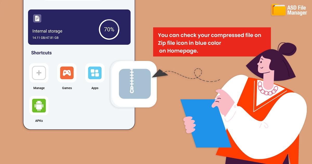 In the file manager app, you can compress your photos, videos, and PDFs into zip files in the ASD file manager app on your Android device. The zip files are ideal if you want to store your large files in less space with others securely and fast.