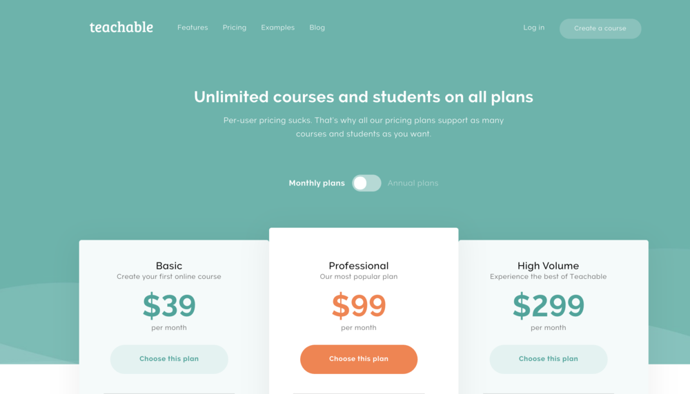 Teachable is a monthly subscription service for people who want to take courses on a site of their own without sharing the profit. For a monthly fee, Teachable will give you everything you need to do that.